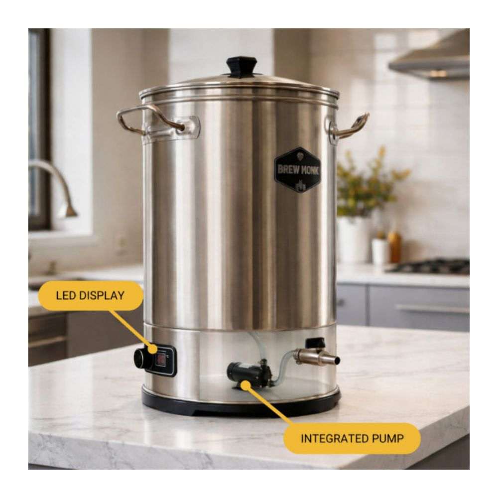 Der Brew Monk S25 Nachgusserhitzer/ Sparge Water Heater mit integrierter Pumpe ist ein temperaturgesteuerter Nachgusserhitzer zur Bereitstellung von bis zu 22 Litern Nachgusswasser für den Läuterprozess beim Bierbrauen. Der Brew Monk Nachgusserhitzer erhitzt das Nachgusswasser auf eine optimale Temperatur (78°C) und fördert es über die integrierte Pumpe direkt weiter, sodass du heißen Nachguss beim Läutern nicht manuell aufbringen musst.