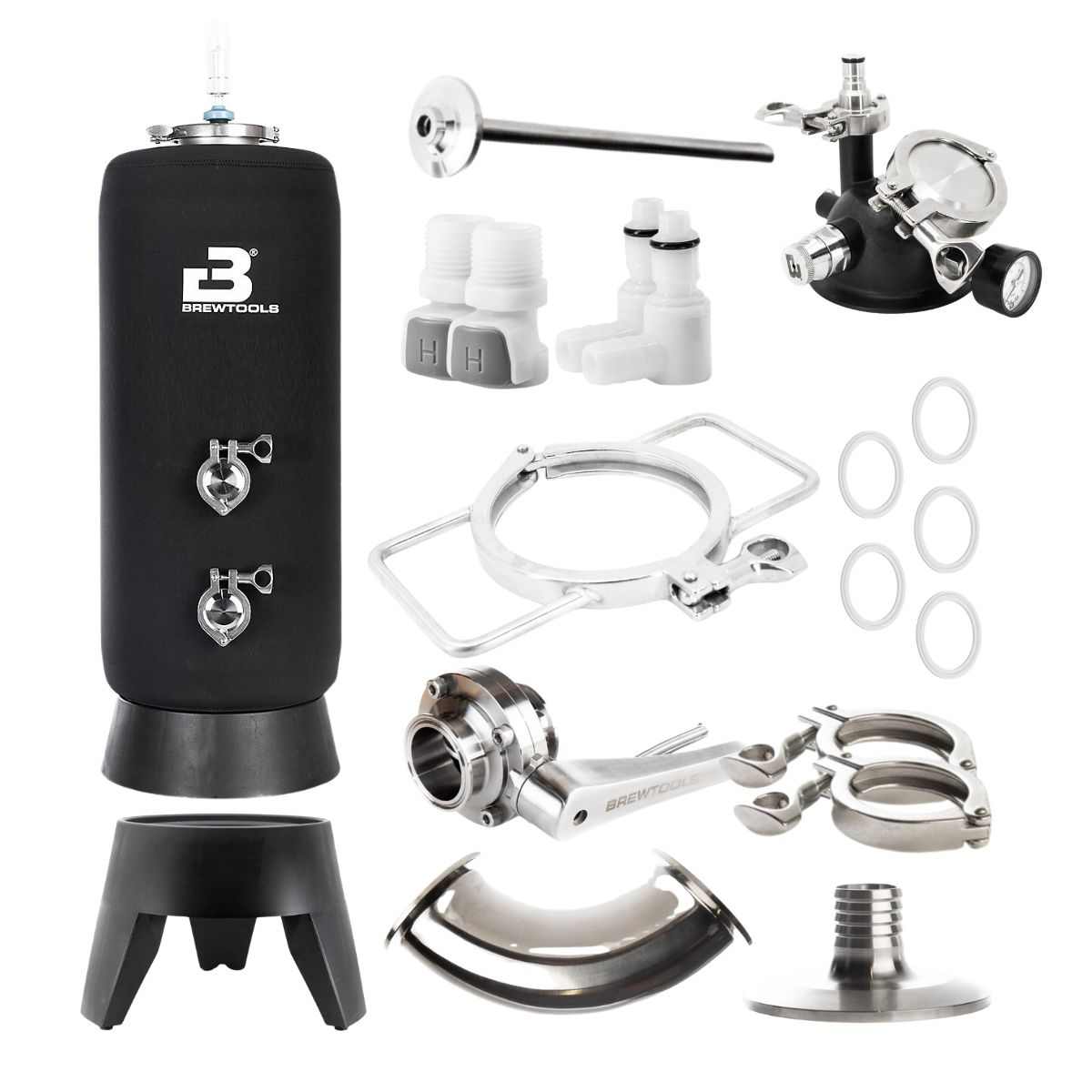 Zusätzlich beinhaltet das Komplettset den MiniUni Standfuß, eine 4″-Klemmverbindung mit Handgriffen, ein 2″-Eckrohr, ein 2″-Schmetterlingsventil, einen 2″-Adapter auf 19 mm Tülle sowie alle notwendigen Klemmverbindungen und Dichtungen. Diese Komponenten ermöglichen eine unkomplizierte Handhabung beim Entleeren, Reinigen und Bewegen des Gärtanks und und bietet auch die Voraussetzung, eine Reinigung des Gärtanks mittels CIP-Verfahren („Clean in Place“) zu machen. Falls du deinen MiniUni mit dem CIP-Verfahren reinigen willst, brauchst du zusätzlich noch die Novax B20 Pumpe, ca. 2-3m Silikonschlauch, den 4″ CIP Adapter, den CIP Sprühkopf, einen TC-34mm Adapter auf 19mm Schlauchtülle, eine 34mm Klemmverbindung & eine 34mm Dichtung. Genauere Informationen zum CIP-Verfahren und wie du den Brewtools MiniUni+ ausrüstest, kannst du in unserem Brewtools MiniUni PLUS „How to“-Guide nachlesen.