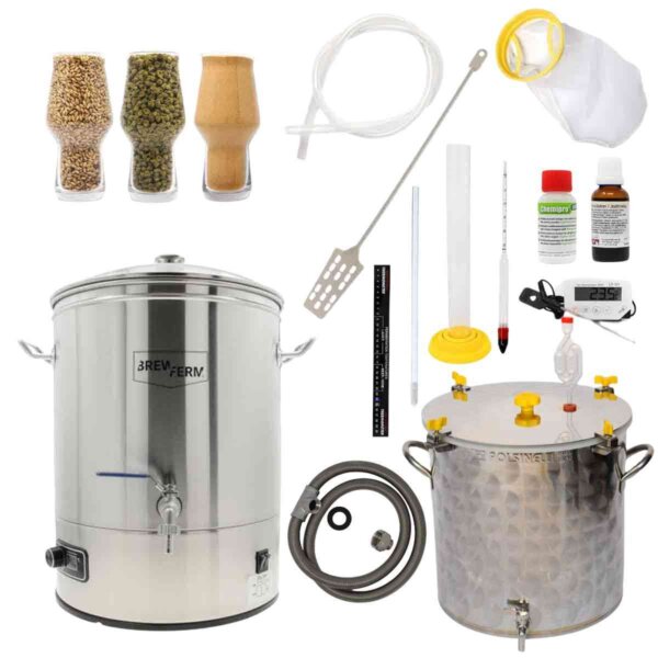 Das Bierbrauset Einkocher Premium bietet Heimbrauern und Gelegenheits-Brauern eine hochwertige Erstausrüstung zum Bier brauen. Als Braukessel dient im Bierbrauset der robuste und langlebige Brewferm Brewer. Zudem beinhaltet das Einkocher Premium Set mit dem dem Polsinelli Gär- & Läuterbottich einen hochwertigen Tank aus Edelstahl, eine dazu passende Läuterhexe, sowie Reinigungs- und Desinfektionsmittel. Damit dein erster Brautag perfekt gelingt, erhältst du zusätzlich das beliebte Braupaket „Otto Normal – Hausbier“, inklusive Malz, Hopfen und Hefe für 23 Liter fertiges Bier. Weitere Details zur Anlage und zu den enthaltenen Produkten findest du in den jeweiligen Produktbeschreibungen.