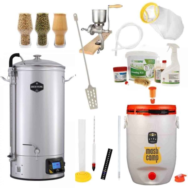 Unser Brew Monk B50 Set – Economy beinhaltet neben der Brauanlage eine Vielzahl an nützlichem und essentiellem Brauzubehör, das du brauchst, um zuhause sofort mit dem Bier brauen loszulegen! So findest du im Komplettset einen 60 Liter Gärbehälter, eine Malzmühle, ein Maischepaddel, das Chemipro Oxi Reinigungsset, Equipment zum Abfüllen deines Bieres und vieles mehr. Damit dein erster Brautag perfekt gelingt, erhältst du zusätzlich zweimal das beliebte Braupaket „Otto Normal – Hausbier“, inklusive Malz, Hopfen und Hefe für 46 Liter fertiges Bier. Weitere Details zur Anlage und zu den enthaltenen Produkten findest du in den jeweiligen Produktbeschreibungen..