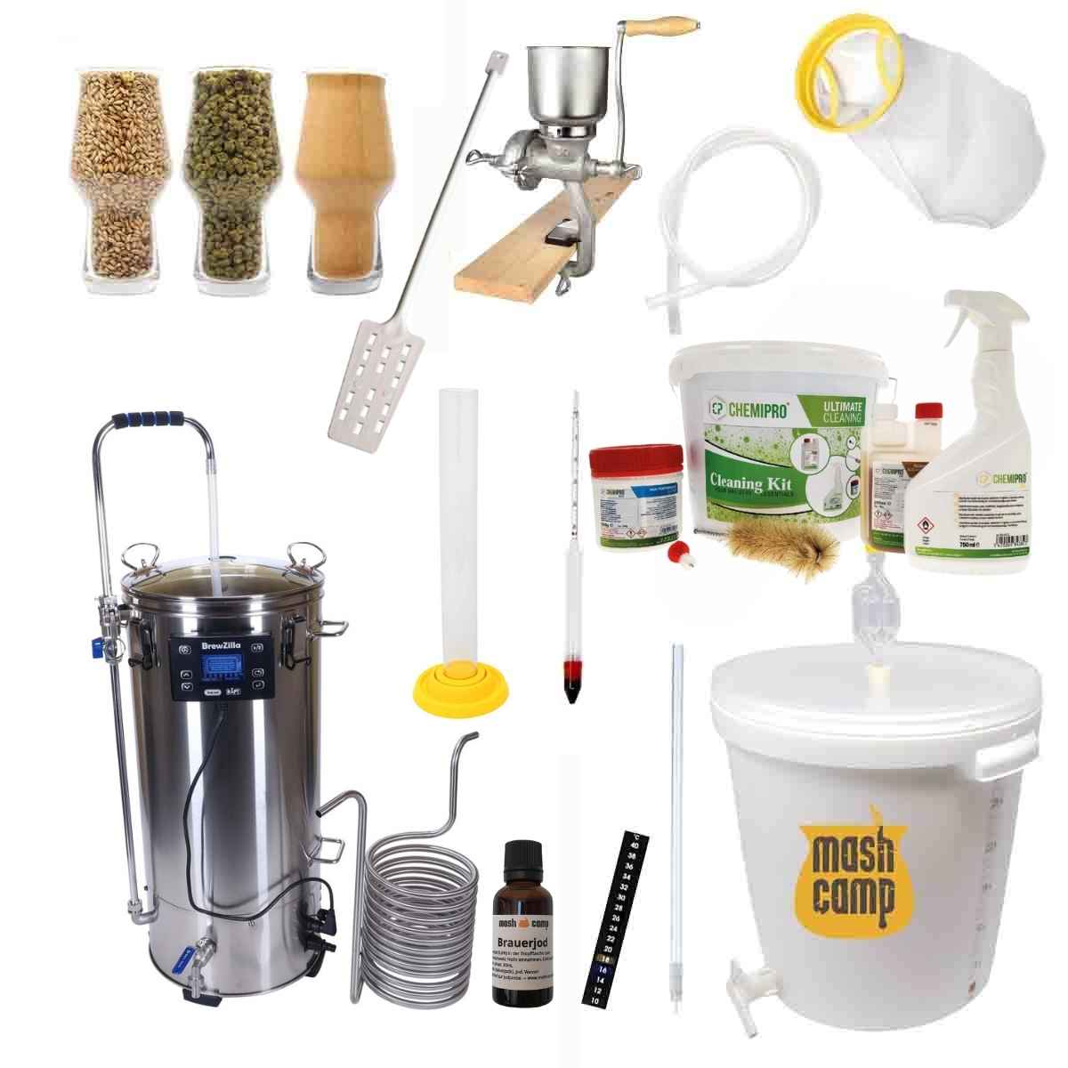 Unser BrewZilla Gen 4 Set – Economy 35L beinhaltet neben der Brauanlage eine Vielzahl an nützlichem und essentiellem Brauzubehör, das du brauchst, um zuhause sofort mit dem Bier brauen loszulegen! So findest du im BrewZilla Gen 4 Set – Economy 35L einen 30 Liter Gärbehälter, eine Malzmühle, Bierspindeln und Zylinder zum Messen der Stammwürze, ein Maischepaddel, das Chemipro Reinigungsset inkl. Eimer, Equipment zum Abfüllen deines Biers und vieles mehr. Damit dein erster Brautag perfekt gelingt, erhältst du zusätzlich das beliebte Braupaket „Otto Normal – Hausbier“, inklusive Malz, Hopfen und Hefe für 23 Liter fertiges Bier. Weitere Details zur Anlage und zu den enthaltenen Produkten findest du in den jeweiligen Produktbeschreibungen.