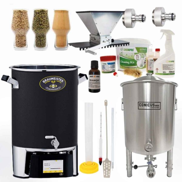 Das Speidel Braumeister Set Komplett Edelstahl 50L Plus ergänzt die Brauanlage um eine Vielzahl nützlicher Werkzeuge und Hilfsmittel, damit du vom Schroten des Malzes bis zur Flaschenabfüllung optimal ausgestattet bist. Enthalten sind unter anderem die hochwertige Grain Gorilla Walzenmühle, der konische Conicus Basic 55l Edelstahlgärtank , Reinigungs- und Desinfektionsmittel, ein Rührlöffel, Messwerkzeuge sowie ein praktisches Abfüllröhrchen für eine saubere Flaschenabfüllung. Ebenso enthalten sind zwei Gardena Stecknippel, mit denen du praktische Gardena-Schläuche mit dem Doppelmantel der Brauanlage unkompliziert anschließen kannst. Damit dein erster Brautag perfekt gelingt, erhältst du zusätzlich das beliebte Braupaket „Otto Normal– Hausbier“, inklusive Malz, Hopfen und Hefe für 46 Liter fertiges Bier. Weitere Details zur Anlage und zu den enthaltenen Produkten findest du in den jeweiligen Produktbeschreibungen.